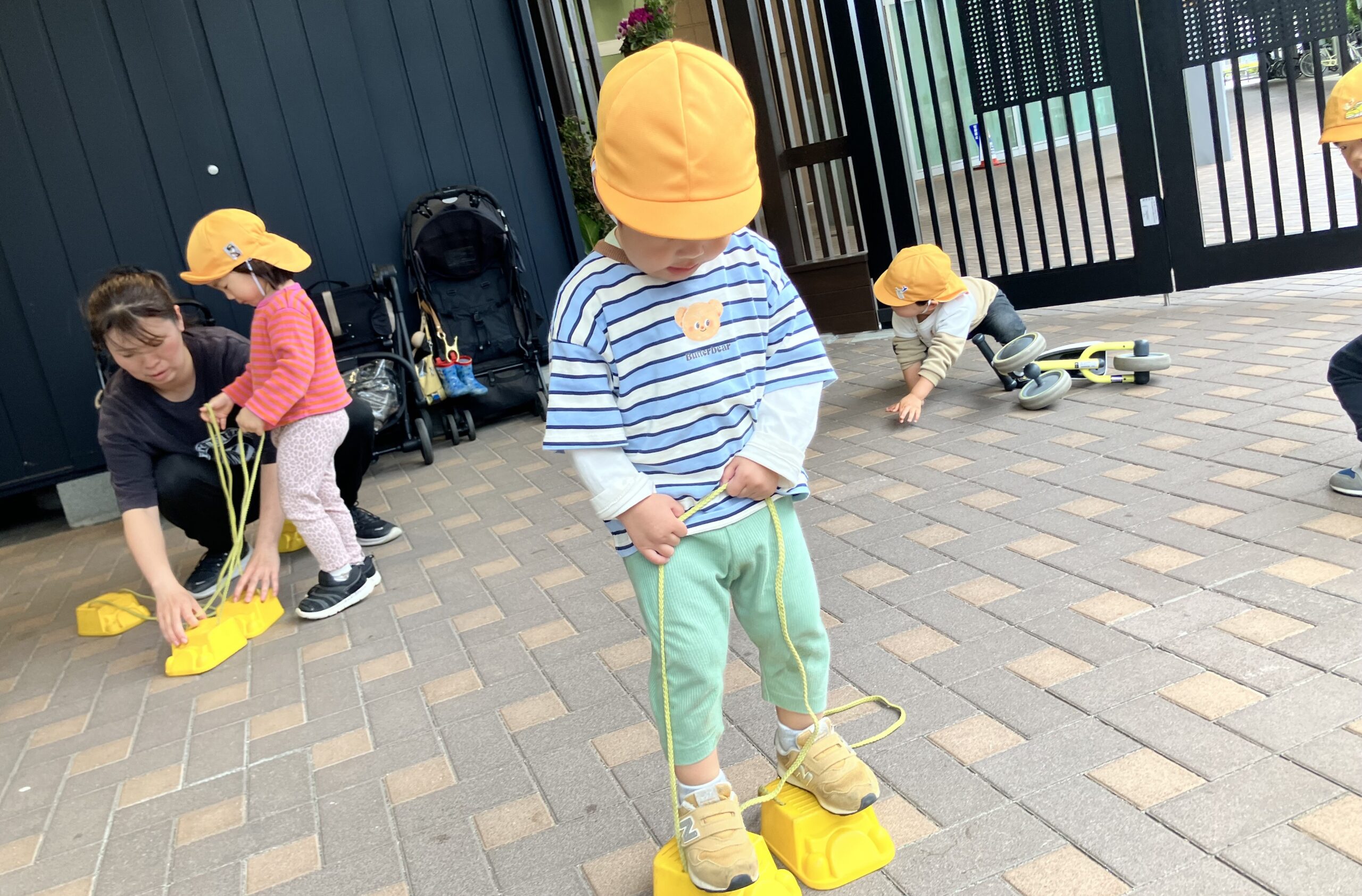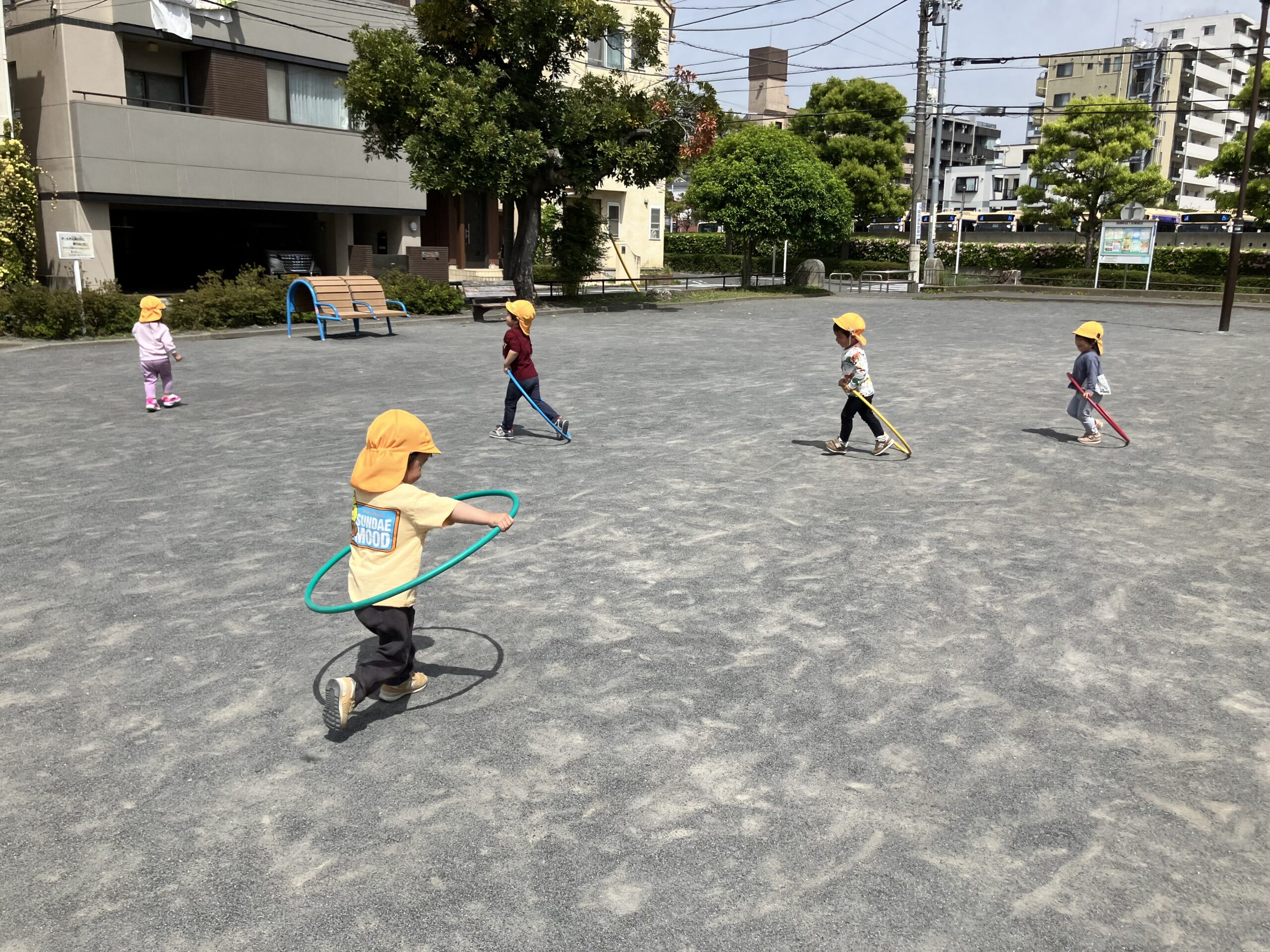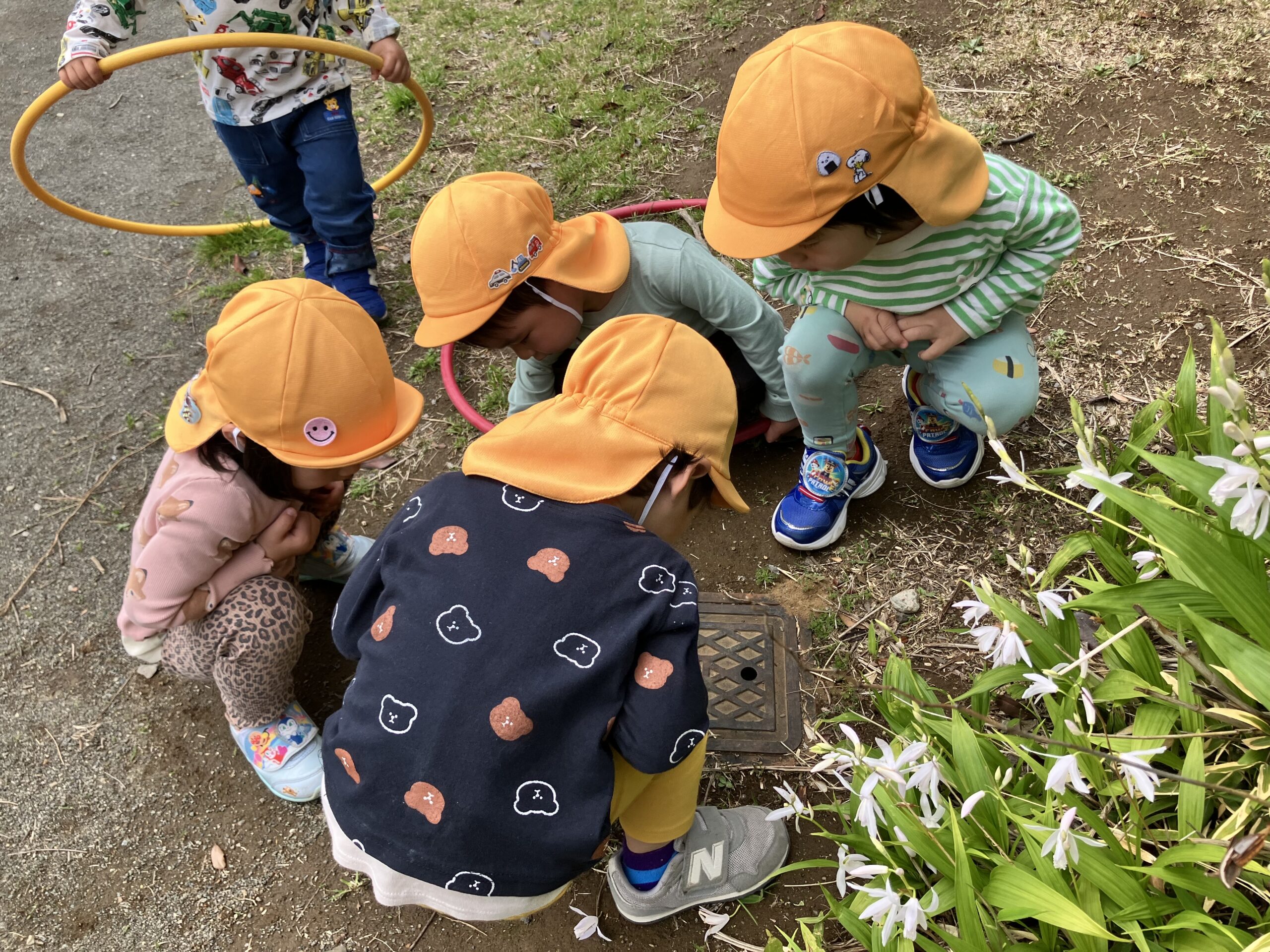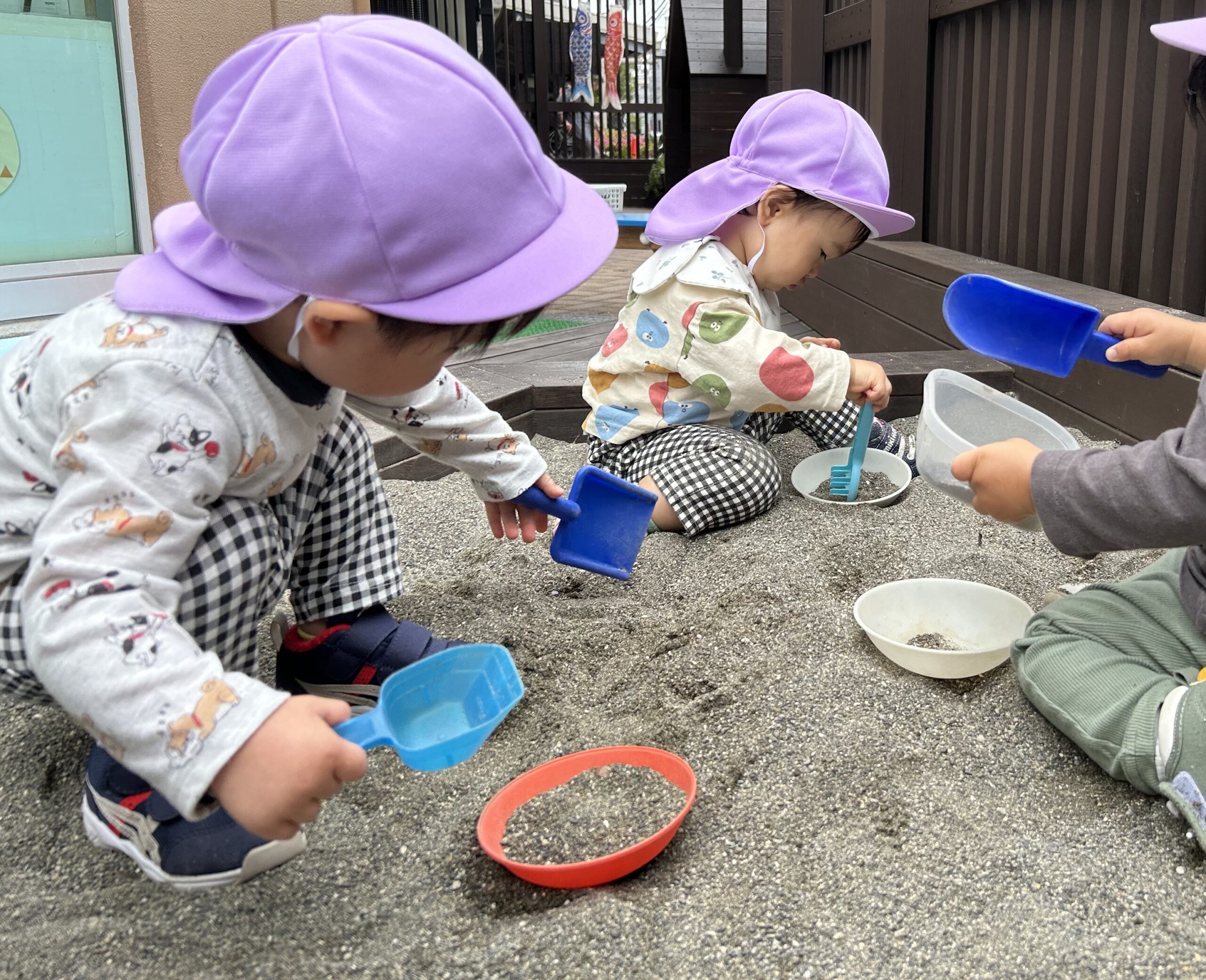 気持ち良いお天気の中、子どもたちは走り回ったり砂遊びをしたりのびのびと楽しんでいます。地面を囲みながら、小さな発見を楽しむ2歳児の子どもたち。何を見つけたのかな?とワクワクするひとときです。きっとしゃがみ込んで見つめる先には、子どもたちだけが見つけた宝物があるのでしょう。