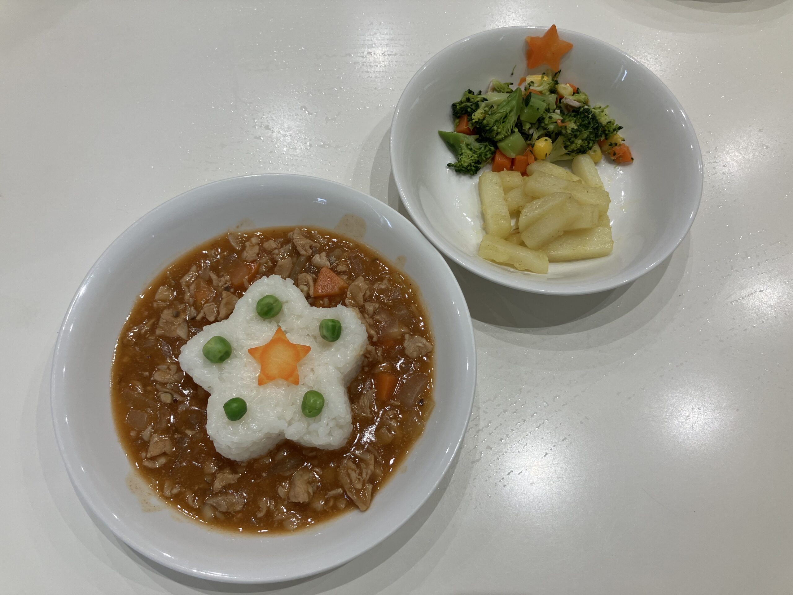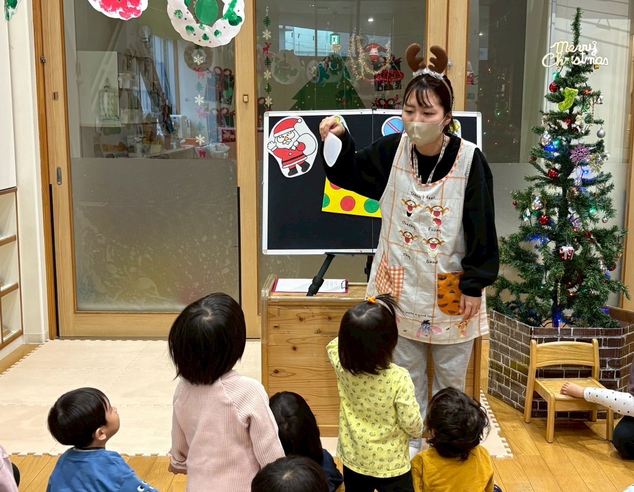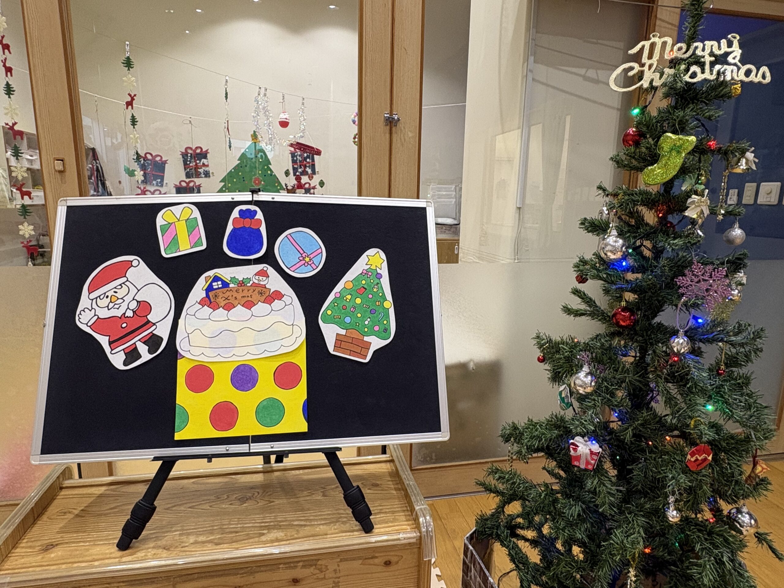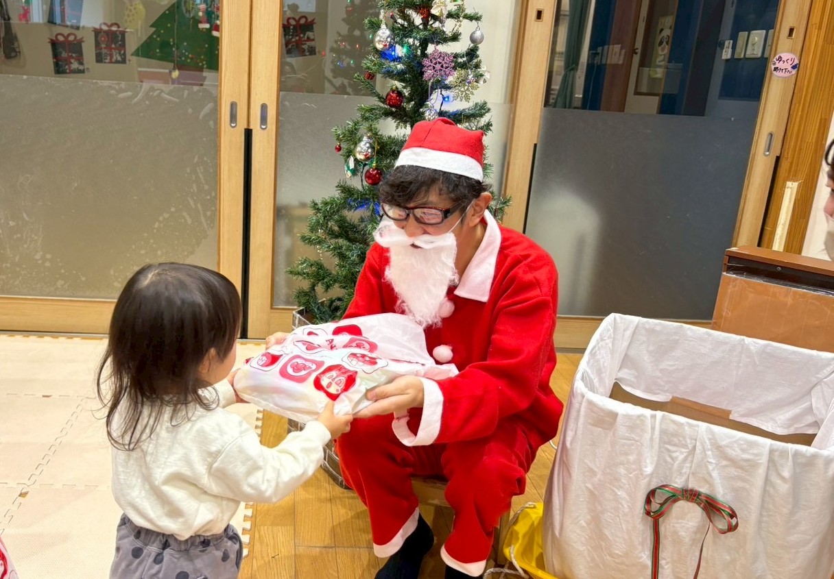 待ちにまったクリスマス会♪パネルシアターでクイズをしたり、お歌に合わせて楽器をならして楽しんでいると・・・鈴の音色とともにサンタクロースがプレゼントを持って遊びにきてくれました🎅子どもたちは少しドキドキした様子でしたが、手を振ったり、タッチをしてもらい嬉しそうにしていました!給食やおやつもクリスマスメニューでみんな喜んで食べていました✨