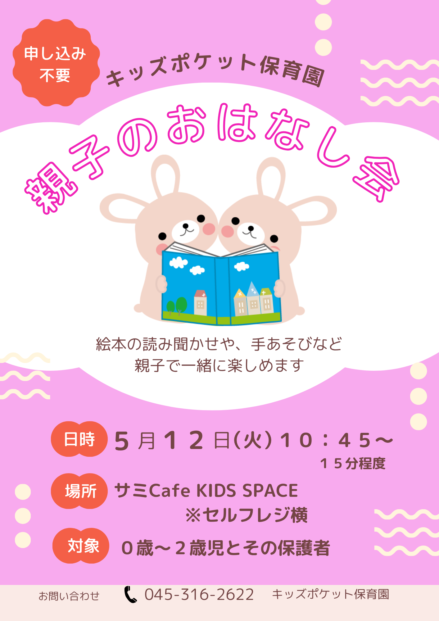 5月の親子のおはなし会は5月12日(火)10:45~開催します。サミットストア横浜岡野店のキッズスペースコーナーで楽しいお話を用意してお待ちしていますので、ぜひ遊びに来てください。ご不明点などありましたらキッズポケット保育園(045-316-2622)までお問い合わせください。
